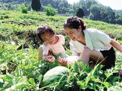 7月28日,重慶市南川區(qū)福壽鎮(zhèn)“南川·福壽西瓜文化節(jié)”暨消費(fèi)扶貧“西瓜采摘季”現(xiàn)場(chǎng),一對(duì)母女在瓜田體驗(yàn)親子采摘樂趣。