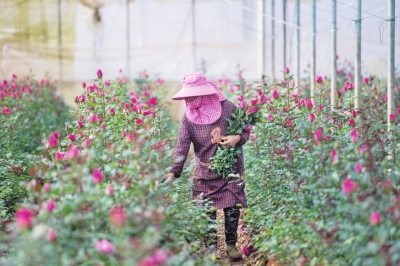 2月15日,在中國云南石林彝族自治縣錦苑花卉產(chǎn)業(yè)園,花農(nóng)采摘和搬運(yùn)鮮花。