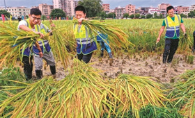 近日,廣州市白云區(qū)人和鎮(zhèn)秀水村白米?片區(qū)十分熱鬧,168畝金燦燦的水稻迎來豐收,人和鎮(zhèn)政府組織人員幫助村民搶收,不少從未在城市里見過如此大片水稻的大人、孩童也被吸引過來,主動(dòng)下田割禾,體驗(yàn)農(nóng)耕文化。