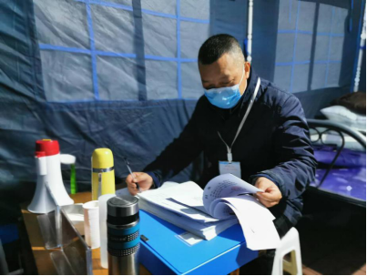 2月15日,天氣驟變,風(fēng)雪交加,在孫學(xué)軍值守的社區(qū)卡點,臨時帳篷被大風(fēng)吹垮,他和另兩名工作人員不等不靠,冒著風(fēng)雪重新搭建帳篷,找來臨時辦公桌椅和簡易取暖設(shè)施繼續(xù)值守。一份發(fā)涼的盒飯,溫暖了所有值守人員的身體,一盞不眠的燈光,照亮的是社區(qū)居民對勝利的期盼。孫學(xué)軍深知,只要帳篷在,黨員在,黨旗在,社區(qū)居民的安全健康就在。